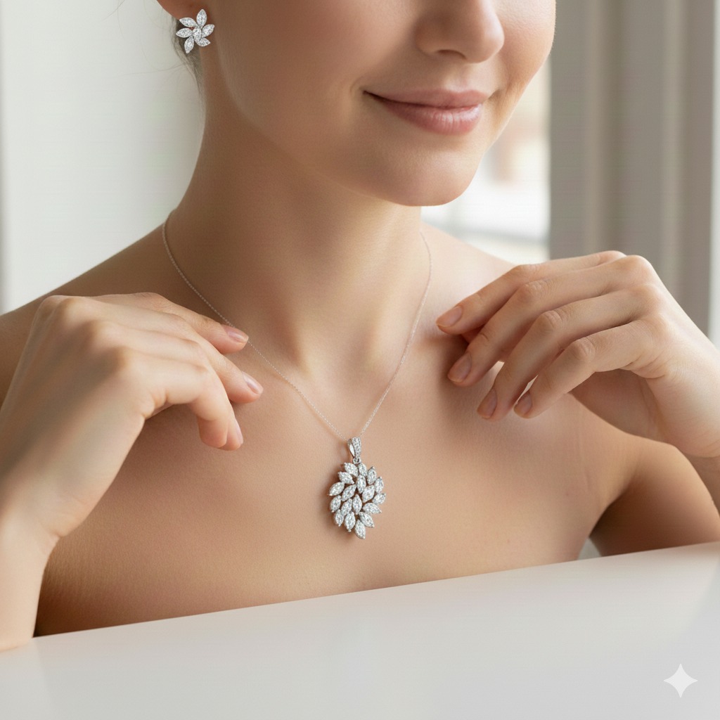 Knowing what to look for makes it simple to identify a genuine 925 silver jewellery set. Authentic pieces always have a "925" or "Sterling" hallmark etched on the necklace clasp, earrings, or pendants.